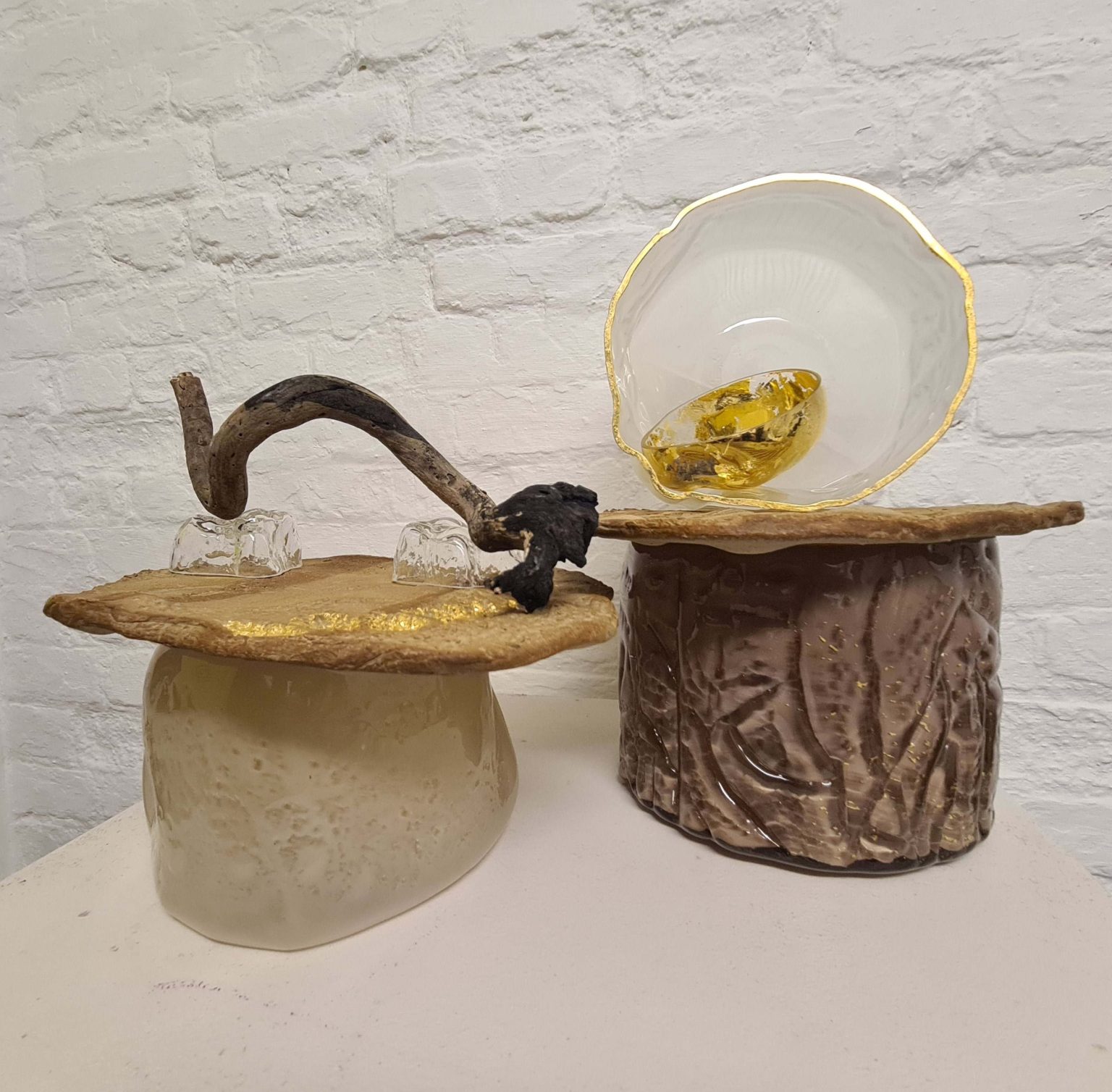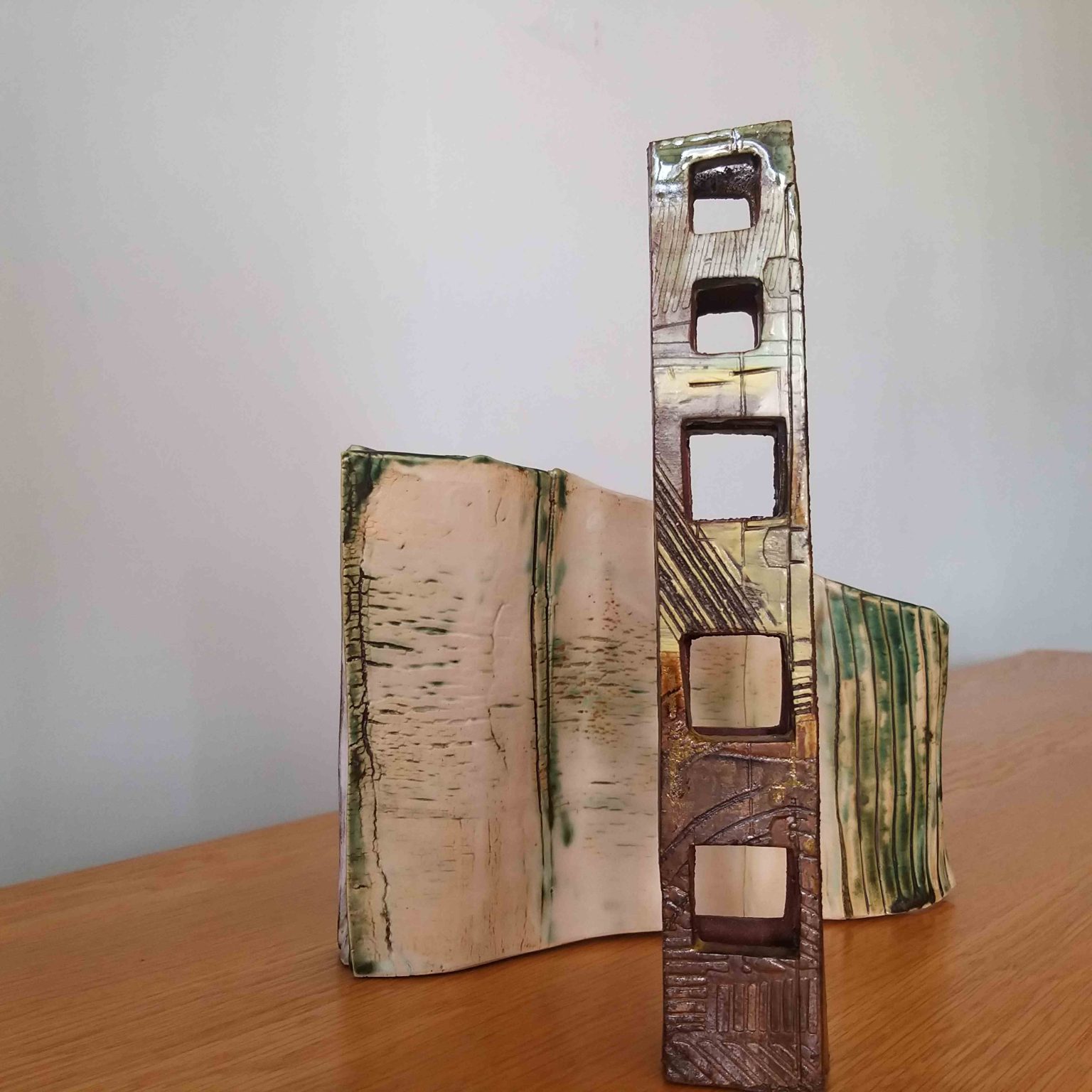 Her final piece, Quiet order, is a pair of small sculptures decorated with coloured slips as a tribute to Farnham’s ceramic heritage. It reflects on the quiet order of our beautiful red bricked market town, and includes textures inspired by her work with our community.